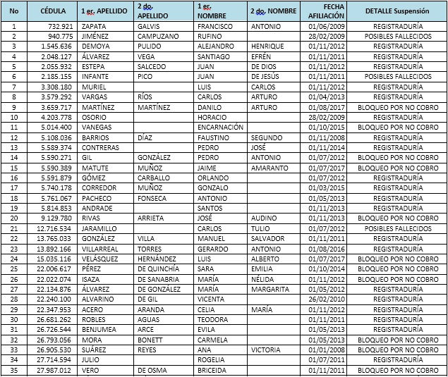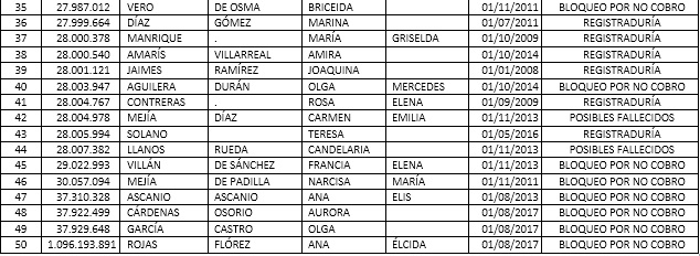 Según Cortés Quintero, a la fecha los adultos mayores relacionados en el listado adjunto presentan bloqueo consecutivo de subsidios programados en dos giros; y de no presentarse, serán retirados del programa según lo establece el artículo 37 del decreto 3771 de 2007).
