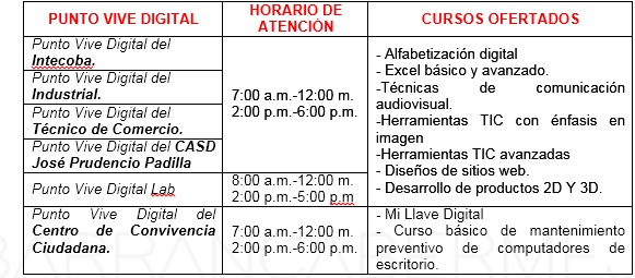 Los interesados pueden inscribirse acercándose al Punto Vive Digital más cercano a su lugar de residencia, llevando fotocopia de la cédula de ciudadanía. Una vez inscrito, el ciudadano recibirá un correo electrónico y/o llamada telefónica para notificarle la fecha de inicio del curso y de la jornada disponible. Estos son los cursos ofertados en cada Punto Vive Digital: