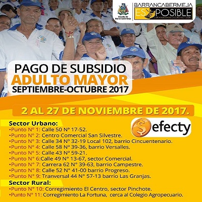 El programa Colombia Mayor beneficia a 4387 adultos en Barrancabermeja, sí se logra que el 100% de los subsidios se entreguen de manera efectiva a los beneficiarios es posible que se aumenten los puntos de entrega y se amplíe la cobertura, tanto rural como urbana, otorgándose nuevos cupos, aumentando la protección a los adultos mayores que se encuentran desamparados, que no cuentan con una pensión o viven en la indigencia o en la extrema pobreza.