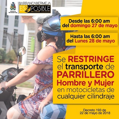 Al respecto, la secretaria de Gobierno Francy Elena Álvarez Ospino dijo que “la ley seca empieza a regir el sábado 26 de mayo a partir de las 6:00 p.m. e irá hasta el próximo lunes a las 6:00 a.m. De igual manera tenemos la restricción del parrillero hombre o mujer la cual empieza a regir el domingo 27 de mayo a las 6:00 a.m. hasta el lunes 28 de mayo a las 6:00 a.m. También está la suspensión de las licencias para el porte de armas que regirá desde el viernes 25 de mayo hasta el miércoles 30 de mayo. Además, todo lo relacionado con el transporte de escombros, basuras, trasteos empieza a regir desde el sábado 26 de mayo hasta el lunes 28 de mayo a las 6:00 a.m. Lo anterior y otras disposiciones fueron tomadas en cumplimiento del Decreto 847 del 18 de mayo, expedido por el Ministerio del Interior”.