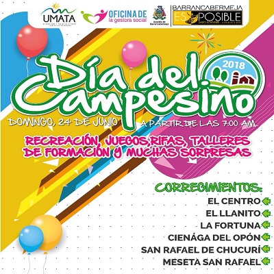 La Administración Municipal se prepara para celebrar el 24 de junio el Día del Campesino en los seis corregimientos: El Llanito, El Centro, La Fortuna, Ciénaga del Opón, San Rafael de Chucuri y Meseta de San Rafael, en una jornada de integración que coordinará la Unidad Municipal de Asistencia Técnica Agropecuaria, Umata, y en la que se le reconocerá a quienes trabajan día a día la tierra y realizan su aporte para dinamizar la economía desde el sector rural.