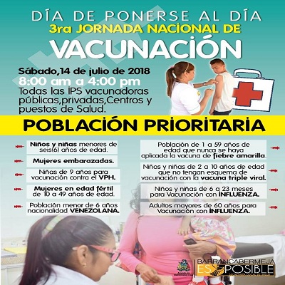 La Secretaría Local de Salud invita a los barranqueños a participar el sábado 14 de julio en la Gran Jornada Nacional de Vacunación, que iniciará a partir de las 8:00 am y que se extenderá hasta las 4:00 pm y que proporcionará biológicos para combatir 26 enfermedades diferentes, además de la vacuna contra la influencia estacional.