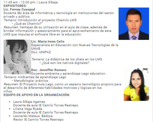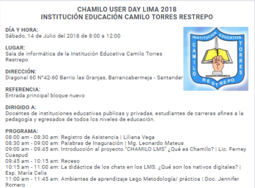 Considerando la importancia de las plataformas virtuales de aprendizaje en la actualidad como medio que facilita el contacto organizado entre un grupo de personas que comparten intereses, la institución educativa Camilo Torres Restrepo realizará el 14 de Julio de 2018, de 8:00 a.m. a 10:00 a.m., el ‘Chamilo User Day’, evento que se realiza a nivel mundial con el ánimo de promover el uso de herramientas tecnológicas para la apropiación de conocimiento.