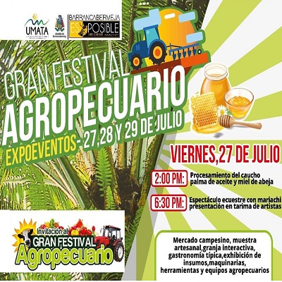La Alcaldía Municipal, a través de la Unidad Municipal de Asistencia Técnica Agropecuaria, Umata, tiene todo dispuesto para el Gran Festival Agropecuario que se realizará del 27 al 29 de julio en Expoeventos y que contará con una amplia agenda en temas relacionados con el sector agrario, pecuario, industrial y productivo para el beneficio de los diferentes productores del sector rural de Barrancabermeja.